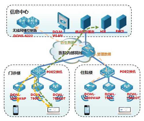 作为医院有线局域网的补充,无线局域网(WLAN )有效地克服了有线网络的弊端,利用PDA 、平板电脑和移动手推车等移动设备随时随地进行生命体征数据采集、医护数据的查询与录入、医生查房、床边护理、呼叫通信、护理监控、药物配送、病人标识码识别,以及基于WLAN 的语音多媒体应用等等,充分发挥医疗信息系统的功能,突出数字化医院的技术优势。